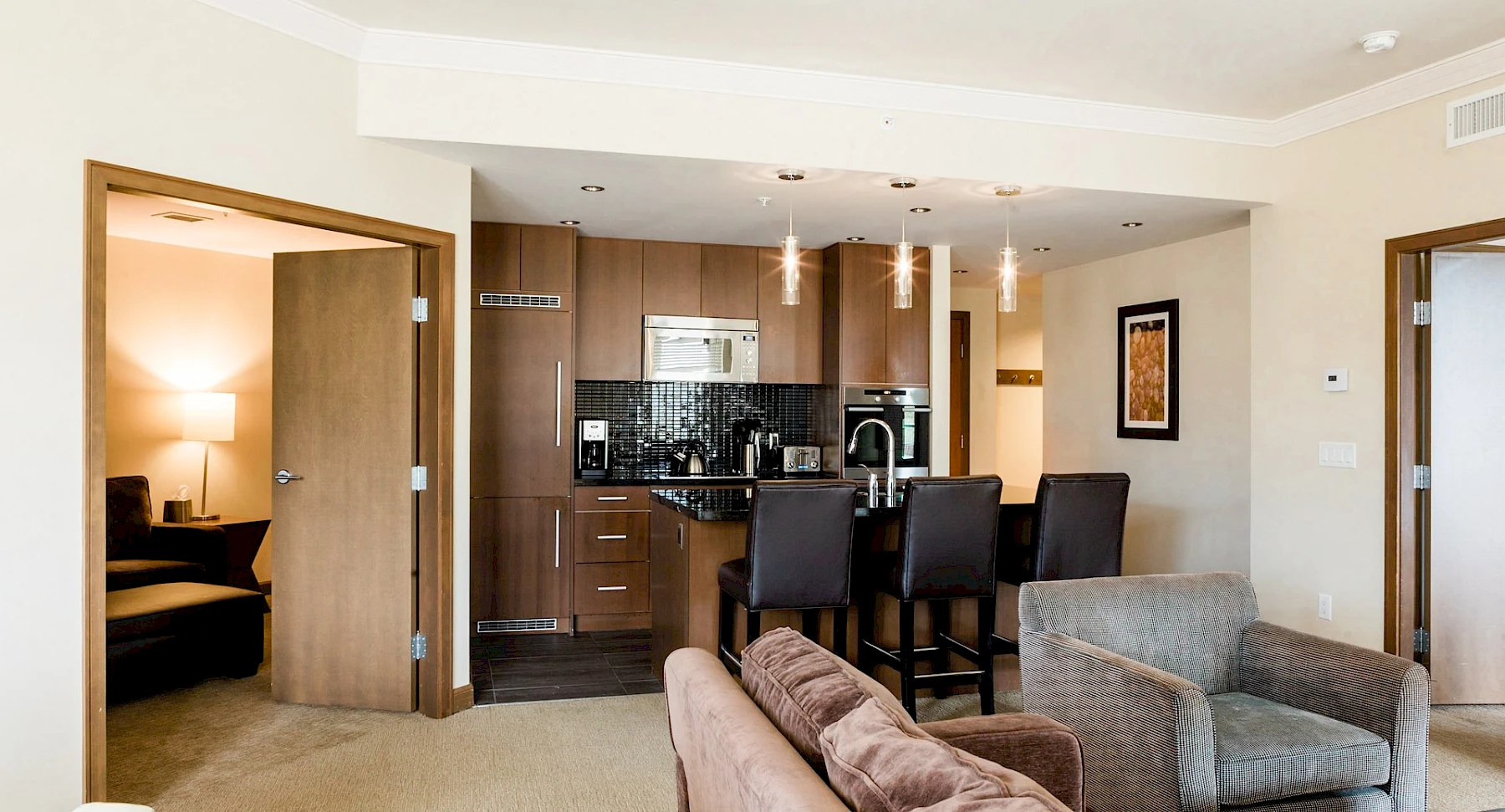 All suites contain high-end furnishings and appliances, including a gas fireplace, stainless steel Miele kitchen appliances, and a washer and dryer.