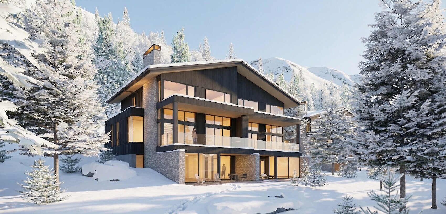 Timber, stone, expansive glass walls, and mountain-modern finishes define peak alpine style.