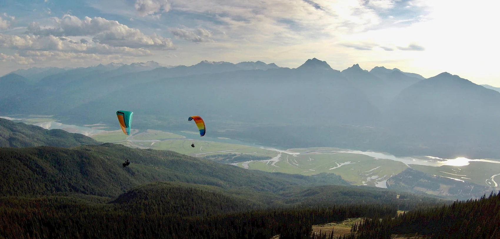 Looking for an extra hit of adrenaline? Take a tandem paragliding flight at Revelstoke Mountain Resort and get an eagle-eye view of the most vertical in North America. Take in the spectacular Monashee and Selkirk mountains, and the mighty Columbia River like you never have before. Fly with a fully qualified pilot, trained and approved under the standards of the Hang Gliding & Paragliding Association of Canada.