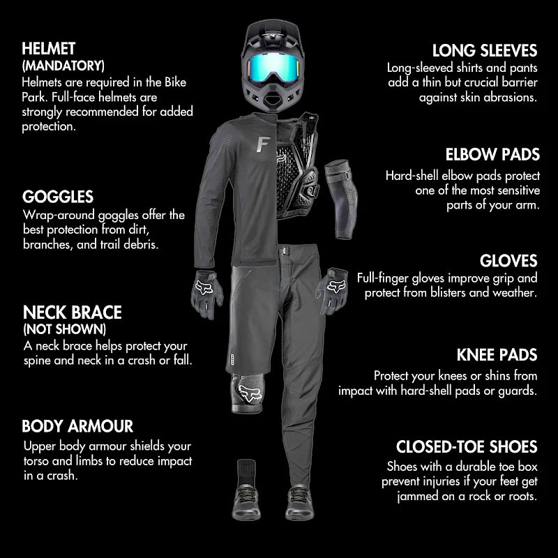 - Protect yourself. Helmets are mandatory in bike parks and strongly recommended on all other trails. Other protective equipment is strongly recommended.