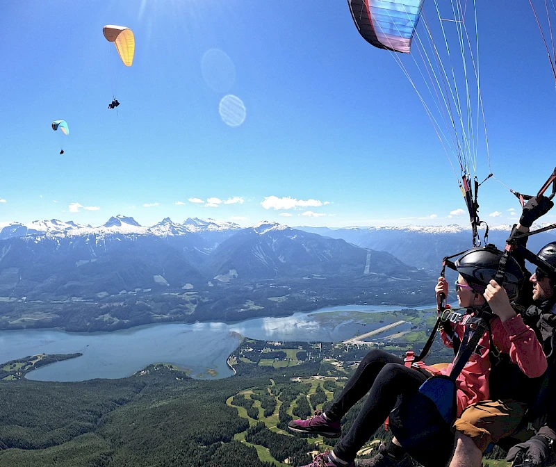 Looking for an extra hit of adrenaline? Take a tandem paragliding flight at Revelstoke Mountain Resort and get an eagle-eye view of the most vertical in North America. Take in the spectacular Monashee and Selkirk mountains, and the mighty Columbia River like you never have before. Fly with a fully qualified pilot, trained and approved under the standards of the Hang Gliding & Paragliding Association of Canada.
