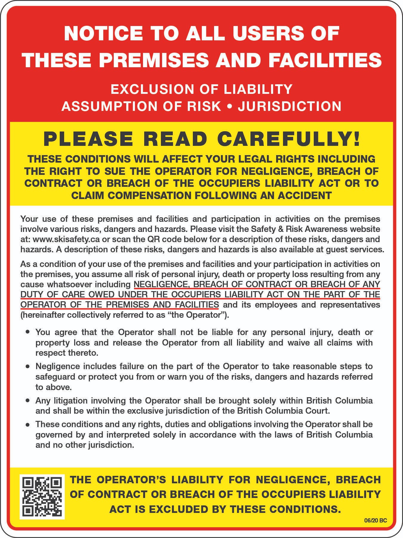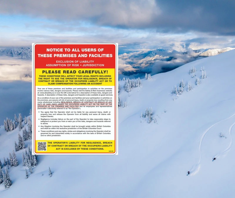 The use of Revelstoke Mountain Resort’s premises, facilities, and participation in activities involves inherent risks, dangers, and hazards. It's a condition of your use and by accessing or using these premises and facilities, you voluntarily assume all risks of personal injury, death, property damage, or loss, regardless of cause, including but not limited to negligence, breach of contract, or breach of any duty of care by Revelstoke Mountain Resort, its employees, or representatives.